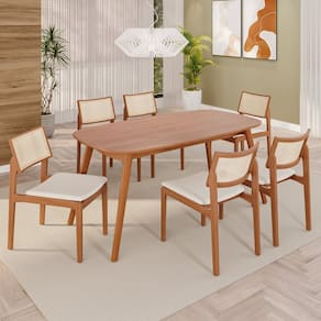 A Sala de Jantar Ceci possui um design moderno e inovador, é o ideal para você que quer aliar resistência e praticidade no dia a dia. Complete a decoração de sua sala com a mesa de jantar com 6 cadeiras. Possui estrutura em madeira maciça e tampo Laminado com canto arredondado, proporcionando design e segurança. Medida da Mesa (A x L x P): 76X160X80 Peso da Mesa: 24,1 kg Mesa suporta até: 15 kg Acabamento da Cadeira/Banco: Verniz Natural Acabamento da Mesa: Verniz Ambiente Principal: Sala de Jantar Cadeira/Banco Estofada: Somente Assento Estofado Cadeira/Banco estofada: Somente Assento Estofado Cadeira/Banco suporta até: 120 kg codigo_ean: 7900288190352 Complexidade da Montagem: Média: pode ser montado por mais de uma pessoa e/ou necessite de maior conhecimento para montagem Cor: Naturalíssimo Cor do Produto: Naturalíssimo Cor Secundária: Marrom De Canto (Canto Alemão): Não Escala de Brilho: Fosco Espessura do Tampo: 15 mm Formato do Tampo: Retangular Itens Inclusos: 1 Mesa, 6 Cadeiras, Manual de Montagem e Ferragens. Linha ou Coleção: Ceci Manual de Montagem e Instalação: https://product-hub-prd.madeiramadeira.com.br/545446299/documents/fd10ed48-e190-4f44-a5fc-e7f258c03b3b30318673528175130971712.pdf Marca: Yescasa Material da Base da Mesa: Madeira Maciça Material da Estrutura da Cadeira: Madeira Maciça Material do Tampo: Laminado Medida da Cadeira/Banco (A x L x P): 82x59x47 Medida do Tampo (L x C x E): 160X80X1,5 Mesa Extensível: Não Necessita Montagem: Sim Origem do Produto: Nacional Peso da Cadeira/Banco: 9,5 kg Possui Apoio Para os Pés: Não Possui Vidro: Sim Quantidade de Cadeiras: 6 Quantidade de Lugares: 06 Recomendações de Uso, Manutenção e Limpeza: Pano levemente umedecido e pano seco. Não utilizar produtos de limpeza Sistema de Montagem: Parafusos, Cavilhas e chave Allem Tipo de Madeira Maciça da Base da Mesa: Tauari