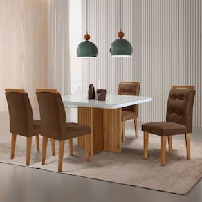 O conjunto é compacto, possui sua estrutura em MDF e acabamento em pintura UV, que proporcionam melhor durabilidade ao produto. As cadeiras tem um designer sofisticado, misturando o moderno e o clássico com seu encosto em detalhes de botões, trazendo conforto e elegância para seu lar.