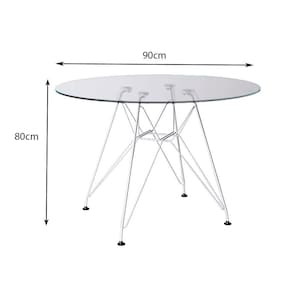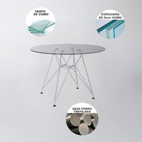 Sala De Jantar Mesa Eames Redonda Vidro 90cm Base Ferro Branco Com 4 Cadeiras PretasA Mesa Eiffel é a escolha ideal para deixar sua casa muito mais bonita e renovada. Essa mesa tem em sua estrutura materiais de altíssima qualidade, que proporciona muito mais resistência, mesmo com o passar dos anos. Ela tem formato redondo e possui espaço para 4 lugares, o que é ideal para um jantar em família. A mesa é versátil e combina com vários tipos de decoração, o que dá mais praticidade em casa.Tipo: MesaModelo: EiffelCor: Tampo Redondo BrancoDimensões do Produto- Altura: 76cm- Diâmetro:Características- Base: Madeira com ferro entrelaçado preto / branco / cobre- Tampo de Vidro / Madeira (mdp) com espessura de 25mm- Necessita Montagem? Parcialmente (Produto Entregue Montado Parcialmente)