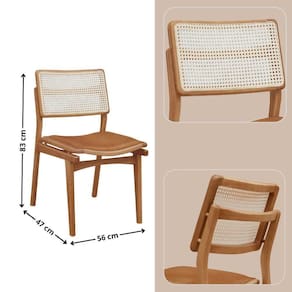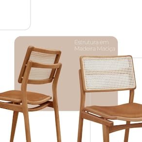 As Cadeiras Eva Premium complementam o conjunto com um toque ainda mais natural e sofisticado. Produzidas em madeira macica, combinam resistencia com um design que valoriza o artesanal. O grande destaque fica por conta do encosto em Ratan, que adiciona leveza visual, ventilacao e um charme atemporal inspirado na estetica organica.