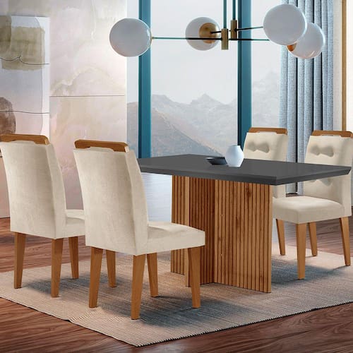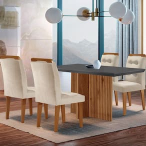 Com espaço ideal para dispor as melhores receitas e recepcionar a sua família, a sala de jantar Olímpia com cadeiras Carol é um móvel completo em todos os sentidos. O conjunto é compacto, possui sua estrutura em MDF e acabamento em pintura UV, que proporcionam melhor durabilidade ao produto. As cadeiras tem um design sofisticado, misturando o moderno e o clássico com seu encosto em detalhes de botões, trazendo conforto e elegância para seu lar. Possui puxador na parte superior do encosto para facilitar a movimentação e evitar o toque ao tecido.