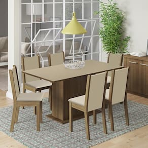 - Itens Inclusos: 1 mesa com base pedestal e tampo em MDP; 6 cadeiras com encosto pintado e assento estofado