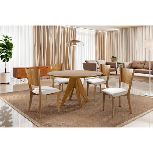 Sala de Jantar Redonda com Vidro Madeira Maciça 4 Cadeiras 1,30m - Ametista - Harmonia Salas A mesa de jantar Ametista é um móvel ideal para sua casa, com design moderno e elegante, que vai agregar a sua decoração tornando sua sala de jantar mais aconchegante! Ela tem a base com um formato que deixa amplo espaço para o encaixe das cadeiras, charmosa e clean. Esse modelo tem a base em madeira maciça de Eucalipto e o tampo em MDF laminado com vidro sobreposto de 4mm, garantindo uma mesa resistente e duradoura. As cadeiras para mesa de jantar Violeta, possuem um estilo elegante e moderno para deixar sua sala de jantar mais bonita e confortável. A cadeira Violeta conta com um encosto em madeira, que proporciona um charme a mais a esse modelo. O assento é fabricado com espuma de densidade D-23 reforçando o conforto do produto, sua estrutura é toda em madeira maciça de eucalipto, ecologicamente correta. Devido à fabricação manual, o que compete ao produto um acabamento impecável, o tempo solicitado é um pouco maior do que o convencional por isso pedimos um prazo um pouco maior do que a maioria dos produtos. No entanto, garantimos que o resultado vale a pena. Faz parte do anúncio: 1 Mesa de Jantar Redonda Ametista com Vidro 1,30m 4 Cadeiras Violeta Obs.: Objetos de decoração não acompanham o produto. Particularidades da Sala de Jantar: Características da Mesa: - Base em madeira maciça de Eucalipto; - Tampo em MDF laminado; - Vidro sobrepsoto de 4mm; - Tampo redondo; - Acabamento em verniz PU semi-fosco; - Madeira tratada e seca em estufa; - Design moderno, sofisticado e diferenciado; - Madeira Ecologicamente Correta; - Baseado em conceitos sustentáveis; Dimensões da Mesa: Altura: 78 centímetros Diâmetro: 1,30 metros Características da Cadeira: - Madeira Maciça de Eucalipto seca e tratada em estufa; - Madeira imunizada; - Espuma D-23; - Estrutura reforçada; - Ecologicamente correta; - Peso suportado recomendado 150kg. Dimensões da Cadeira: Altura: 89 centímetros Altura do assento: 48 centímetros Largura: 44 centímetros Profundidade: 44 centímetros Informações Importantes: - Produtos podem apresentar diferenças de tonalidades entre a foto na tela e o produto real, devido a calibração de cor de tela. - Limpar com flanela ou pano macio. Não utilizar álcool. Não utilizar produtos abrasivos ou corrosivos - Nós prezamos pela qualidade da entrega em primeiro lugar, trabalhamos com transportadoras altamente selecionadas e os melhores materiais de embalagem. - As cadeiras vão 100% montadas nas caixas e embaladas. Não necessita da montagem de um profissional. - Objetos de decoração não incluso. - Certifique-se de que o produto caiba em elevadores e vãos de escadas, não fazemos içamentos ou desmontagens de produtos. Quaisquer despesas deste tipo ficam a cargo do cliente - Garantia de 3 meses contra defeitos de fabricação. Marca: Harmonia Salas