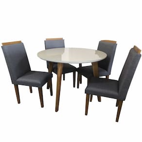 Estrutura: Tampo de MDF de 25 mm espessura com vidroFormato: Tampo redondo na cor OFF WHITEVidro: Sim, temperado com espessura de 3 mmAcabamento: Pintura U.V de alta resistênciaPés: Sim, em madeira maciça com suporte dos pés em metal e sapata antiumidade nos pésCadeira