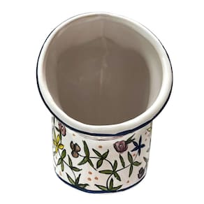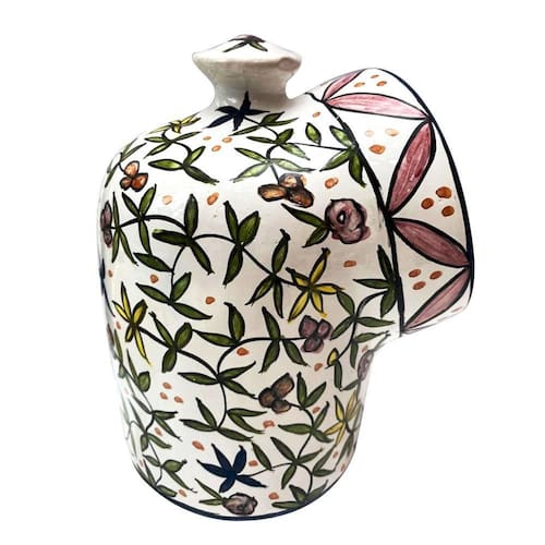 cada peça é uma, os desenhos podem ser parecidos , mas se você perceber existem diferenças entre cada peça, pois são pintadas em momentos diferentes, com inspirações diferentes. Essa peça é uma faiança , que é uma forma de cerâmica branca, que possui uma massa cerâmica menos rica em caulim do que a porcelana e é associada a argilas mais leves e flexíveis. São massas porosas de coloração branca ou marfim e precisam de posterior vitrificarão. As peças são feitas individualmente por ceramistas, baseados na faiança portuguesa que é o termo é utilizado para designar as tradicionais cerâmicas de portugal, que têm origem nas culturas megalíticas que ocuparam o ocidente da península ibérica milênios atrás. As peças são pintadas de maneira diferente, não existirão duas iguais. A imagem que você está vendo dá uma ideia do desenho, existirão diferenças. O processo de produção da peça é manual sendo faiança tradicional, nossa cerâmica é transformada em líquida enchemos moldes de gesso, feito isso vai p secagem e acabamento. Depois queimamos transformando de barro p cerâmica, feito isso a peça é esmaltada pintada, logo na sequência vai ao forno novamente sendo queimada a 1080 graus. Na sequência a peça é queimada transformando de barro p cerâmica, feito isso a peça é esmaltada pintada, imediatamente vai ao forno novamente sendo queimada a 1080 graus, vitrificação. Pronto se ela sobreviveu a tudo isso , temos uma peça linda, diferenciada feita a mão. As peças poerão craquelar com o tempo, é normal, mostram vida à sua peça. As peças podem ter pequenos furinhos são normais na queima da cerâmica e vitrificação. Marca: Faiança