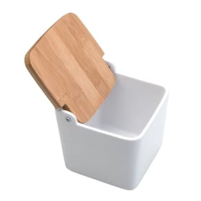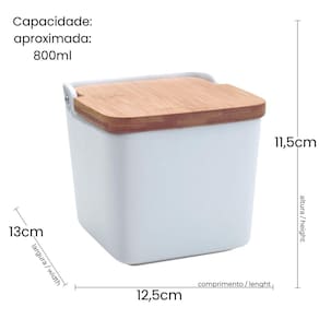Saleiro grande de cerâmica branco tampa bambu bancada O saleiro com tampa em bambu vai ajudar a deixar sua cozinha mais organizada e preparar os seus alimentos com mais praticidade, além de ser uma peça decorativa linda. Produzido em cerâmica, já vem com a colher e tem capacidade para cerca 800ml, podendo ser para sal, alho ou tempero de sua preferência. Características do produto Material: cerâmica e bambu Dimensões axlxp : 11,5 x 12,5 x 13 cm Capacidade aproximada: 800ml Imagens ilustrativas e dimensões aproximadas, os demais produtos não acompanham o item. As cores podem variar de acordo com a tela do celular ou computador. Itens inclusos: 1 saleiro Limpeza e conservação Não usar abrasivos e produtos químicos como removedores de gordura, água sanitária, limpa vidros. Lavar com detergente neutro, esponja macia e secar imediatamente. Não lavar em máquina de lavar louça. Marca: Não Informado Ean: 7899768057769