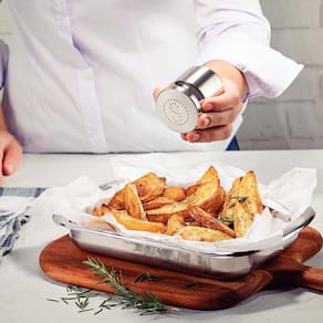 - Este Saleiro totalmente em Aço Inox com tampa perfurada no formato de S, além de facilitar a saída do ingrediente, já mostra o que contém no recipiente.