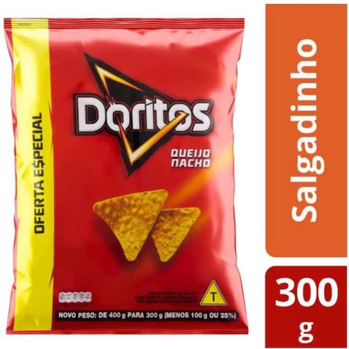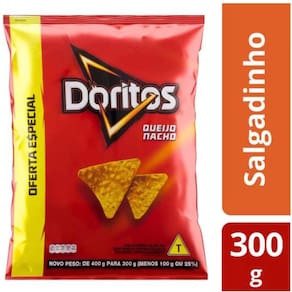 Pacote contendo 300 gramas de salgadinho de milho Doritos sabor Queijo Nacho.