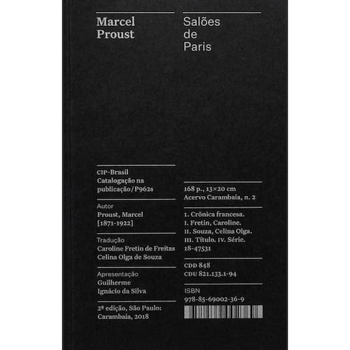 Antes de se tornar o autor consagrado de "Em busca do tempo perdido", Marcel Proust, como tantos escritores de sua época, passou pelo jornalismo. Foi nos periódicos franceses que publicou seus primeiros textos: crônicas em que descreve os salões pari sienses – espécies de saraus literários e musicais, frequentados por aristocratas e gente da alta sociedade da época –, críticas de moda, arte e literatura, além de textos inspirados na atualidade política e até policial. "Salões de Paris" traz uma seleção de 21 crônicas escritas por Proust e publicadas na imprensa francesa, principalmente no jornal Le Figaro, mas também em periódicos de curta duração como o "Le Mensuel" (que circulou entre outubro de 1890 e setembro de 1891) ou revistas espec ializadas, como a "Revue d’Art Dramatique" (1886-1909) ou a Revue Blanche (1889-1903). O design da coleção é assinado pelo Bloco Gráfico, constituído por Gabriela Castro, Gustavo Marchetti e Paulo André Chagas. Os livros têm acabamento em brochura, formato 13x20 cm, e utilizam papéis especiais e certificados: o sueco Munken Print Cream 80 g/m2 no miolo e o escocês Pop Set Black 320 g/m2 na capa. Outro detalhe do volume é a inclusão de um fitilho bordado com o logo do Acervo. Marca: CARAMBAIA GERAL