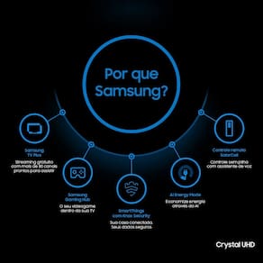 Transforme seu conteúdo em 4K Processador Crystal 4K ¹ O processador exclusivo da Samsung faz a otimização de seu conteúdo para 4K ou o mais próximo possível dessa resolução, conforme a cena. *Essa otimização é chamada de 'upscaling'.