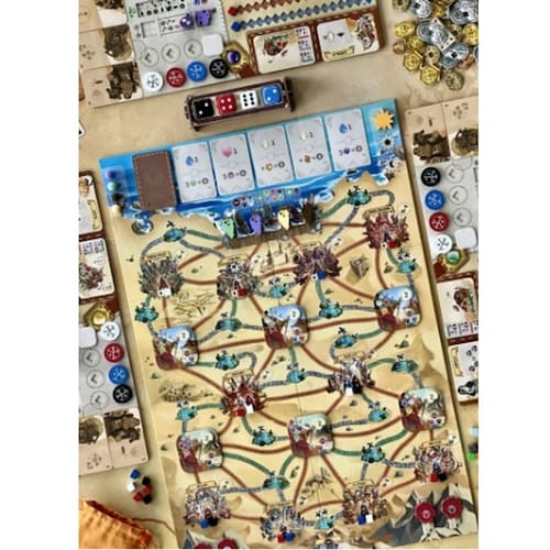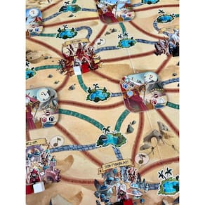 Como é habitual nos jogos de produção própria da Devir, a caixa está repleta de componentes de alta qualidade, concebidos para criar a melhor experiência de jogo possível. O tabuleiro central mostra os diferentes locais pelos quais os jogadores se deslocarão: o porto, no topo, e as cidades, oásis e acampamentos acima do deserto. Diferentes caminhos são mostrados entre todos esses pontos: as rotas estabelecidas (cinza e verde) e os atalhos (laranja). É um tabuleiro cheio de detalhes, tanto estéticos quanto funcionais, onde os jogadores irão interagir em busca dos produtos que mais desejam.