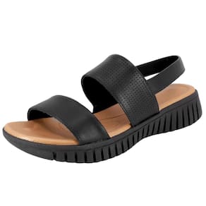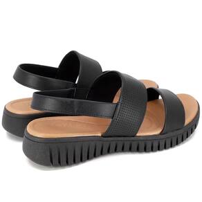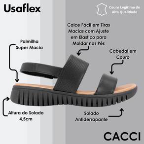 Sandália salto plataforma em cabedal couro napa valise na cor preto, com detalhe laser. O modelo possui tecnologia Calce Fácil, com modelagem inteligente em adaptar o calçado a ergonomia dos pés.