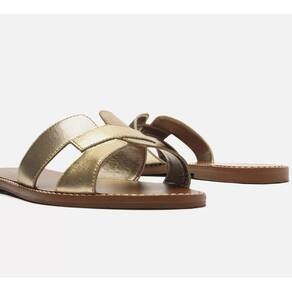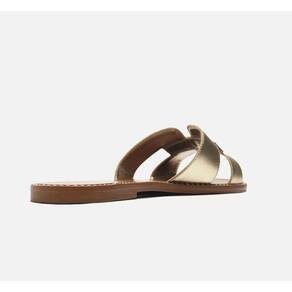 Medidas Material: Couros Cor: Metalizado e preto Tamanho do salto: 1.0cm Descrição: Rasteira dourada ou preta. O modelo tem sola flat e formato arredondado na ponta. Traz cabedal em tiras vazadas no formato H, além de costuras pesponto por todo o contorno. Com palmilha bege e inscrição do nome da marca. Aberta, exibe todo o pé.