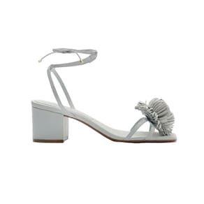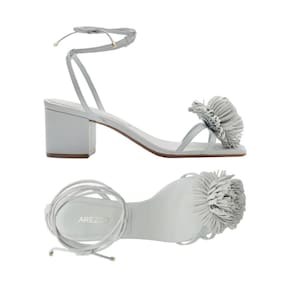 Descrição: Sandália azul clara. O sapato tem salto médio bloco e formato quadrado na ponta. Traz tiras finas sobre os dedos com aplicação de pompom de suede. Possui tira fina que sai das laterais, se cruza no calcanhar, contorna o tornozelo e fecha em amarração superior. Com palmilha da cor da sandália e inscrição do nome da marca. A sandália exibe todo o pé. Referência: A1190101420003