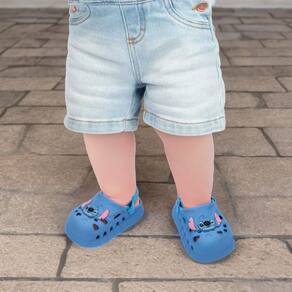 O solado antiderrapante oferece segurança em cada passo, seja em ambientes internos ou externos, contribuindo para mais estabilidade e proteção durante as brincadeiras. A personalização fica por conta da cor azul característica do Stitch, combinada com detalhes em serigrafia exclusivos que reforçam a identidade do personagem e tornam o modelo ainda mais especial.