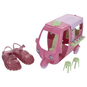 Está fazendo muito calor em Malibu e a Barbie acaba de chegar com a sua nova sorveteria sobre rodas, trazendo muita diversão e refrescância! Em um formato super lúdico, lembrando os icônicos tuk-tuks indianos, possui 3 rodas livres, toldo retrátil e é totalmente decorada com a temática de sorvetes, e acompanha todos os itens essenciais para a Barbie atender a clientela exigente de Malibu! Vem com estante para apoio dos preparos, 2 bancos na altura ideal para a Barbie, pia, máquina de milkshakes, colher de sorvete e 6 preparos prontos para deixar a imaginação fluir! No topo, é decorado com um sorvete derretido super divertido, possui banco para a motorista e porta traseira para fácil acesso das bonecas! Totalmente fabricada em PP, com personalização por adesivos. Deixando a brincadeira ainda mais divertida e confortável a sandália foi pensada para abraçar os pezinhos, com uma palmilha super anatômica, a sola flat com detalhes tratorados agregam mais personalidade.