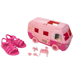 Uma viagem ao universo Barbie com o promocional Road Trip. Com personalização de adesivos retrôs, texturas e muitas peças interativas, o Motorhome se torna uma opção superdivertida para as minis aventureiras. Um dos diferenciais da casa móvel da Barbie é a escrita em braile na parte superior com a frase "A aventura começa aqui". Já a sandália, dispensa comentários, inspirada no modelo aranha, traz nas suas tiras um efeito "Bubble" que a deixa ainda mais confortável para as aventuras do dia a dia. E claro, assinatura da icônica Barbie na sola e silhueta em relevo em uma das tiras superiores