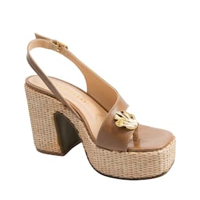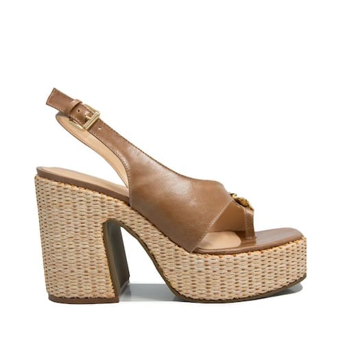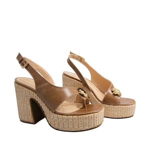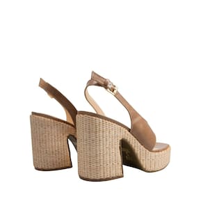 Sandália em couro marrom, com salto bloco alto e revestimento em trama que remete ao palha trançada, trazendo um charme rústico e sofisticado. O modelo possui tira frontal com detalhe em metal dourado em formato de folha, além de tiras laterais com ajuste em fivela para um calce seguro. A palmilha macia garante conforto, enquanto o design combina elegância e modernidade, perfeito para produções cheias de estilo.