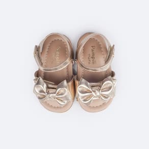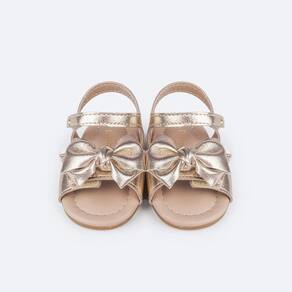 Sandália de bebê feminina em sintético dourado com aplicação de laço duplo na parte frontal, uma fofura. Sandália com palmilha forrada e enchimento de espuma, dando conforto aos pezinhos sem interferir no desenvolvimento natural. A sandália infantil feminina é fácil de calçar, facilitando o dia a dia da mamãe! O solado é emborrachado e flexível, deixando as nossas bebês com mais confiança e segurança nos primeiros passinhos.