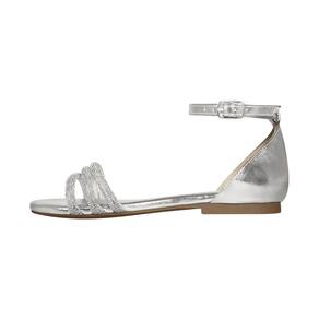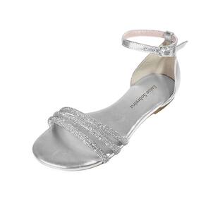 Linha de Rasteira Luiza Sobreira, produzida em material sintético metalizado na cor prata com detalhes em strass, bico redondo, com palmilha em espuma ergonômica e forro em P.U., solado em TR.