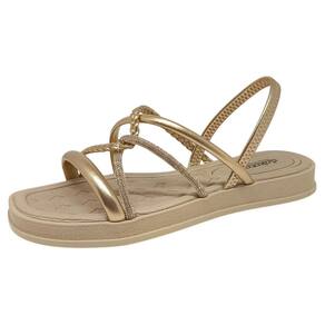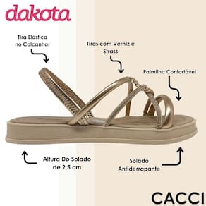 Essa sandália Dakota foi criada para quem busca um calçado versátil que una elegância, conforto e praticidade em todos os momentos. Seu design é composto por tiras modernas que misturam o acabamento em verniz com aplicação de strass, garantindo brilho, sofisticação e um charme especial em qualquer produção, além de uma tira trançada que valoriza ainda mais o visual. O modelo conta com tira elástica no calcanhar que facilita o calce e oferece ajuste firme e confortável ao pé, proporcionando segurança e liberdade de movimento durante todo o uso. Para maior bem-estar, a palmilha é confortável e macia, permitindo caminhar longas horas sem abrir mão do aconchego. O solado flatform de 2,5 centímetros de altura traz um toque de modernidade e ainda proporciona uma leve elevação, enquanto sua base antiderrapante garante firmeza e estabilidade em diferentes tipos de solo. Ideal para acompanhar desde combinações leves com shorts e vestidos até looks mais elaborados, essa sandália é a opção perfeita para trazer estilo, comodidade e confiança em qualquer ocasião do dia a dia.