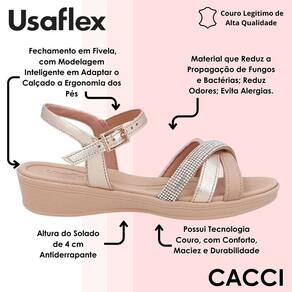 Outro destaque importante está no solado de 4 cm, que garante uma elevação ideal para o dia a dia, ao mesmo tempo em que proporciona segurança com sua base resistente. A modelagem inteligente se adapta com facilidade, acompanhando os movimentos com flexibilidade e firmeza. Ideal para quem valoriza beleza, qualidade e funcionalidade em um único calçado.