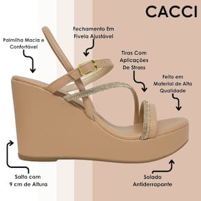A nova Sandália Salto Anabela da Cacci é a escolha perfeita para quem busca unir elegância e conforto em um só calçado. Com um design moderno e sofisticado, ela traz o charme das tiras com detalhes em strass aplicados, que adicionam um toque de glamour ao visual. O salto anabela de 9 cm, com solado antiderrapante oferece estabilidade e segurança para que você se sinta confiante a cada passo. Ideal para compor looks que vão do casual ao elegante, essa sandália é uma combinação perfeita de estilo e praticidade.