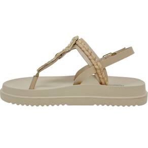 Seu destaque fica por conta da peça aplicada sobre o pé, que adiciona um toque de sofisticação ao modelo, assim como as tranças nas tiras, que conferem um ar artesanal. Ainda conta com sola flatform de 3cm, que proporciona conforto e leveza ao caminhar, ideal para os dias mais quentes, assim como o calce fácil, graças à tira maleável e sem fechamentos que envolve o calcanhar.