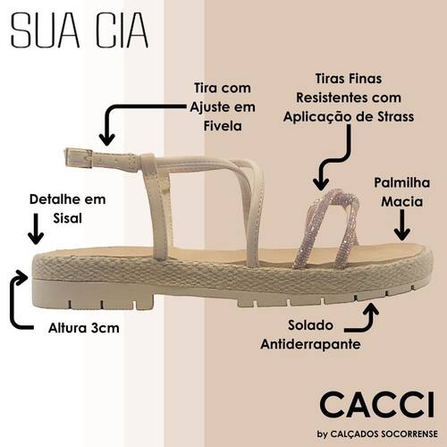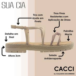 É aliada do seu conforto no dia a dia. Seu cabedal consiste em duas tiras prontas de strass que se conectam em uma amarração que mantém os dedos firmes. Outras tiras acompanham o seu pé até o calcanhar, que possui fechamento por fivela. Sua palmilha super macia é feita em EVA, a entressola apresenta acabamento em sisal e o solado com salto de aproximadamente 3 cm de altura em EVA é texturizado para te dar a segurança que você precisa. Perfeita pra você!