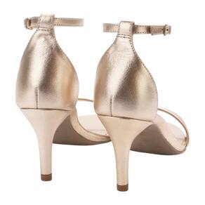 Sandália de couro. O modelo tem salto médio fino e bico redondo. Traz tira média sobre os dedos. Fechada no calcanhar, possui tira fina em torno do tornozelo com fechamento prático em peça metálica lateral. Com palmilha bege e inscrição do nome da marca. A sandália exibe todo o peito do pé e os dedos.