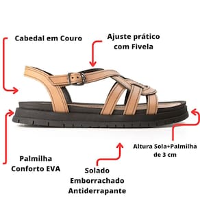 Una estilo e conforto com sua nova parceira de dia a dia, perfeita para os momentos de lazer. Seu design inovador apresenta peças entrelassadas na parte frontal, criando um visual moderno e arrojado que também deixa grande parte dos pés à mostra, conferindo um toque feminino. O fecho prático na tira que envolve o calcanhar oferece um ajuste seguro, permitindo que você caminhe com confiança. Além disso, a sandália é marcante pela costura escura que percorre todo o modelo, proporcionando um detalhe despojado que acrescenta um charme extra à peça.