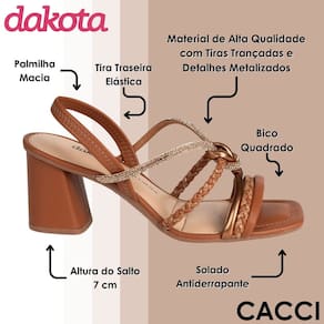 A Sandália Dakota é a combinação perfeita entre estilo, elegância e conforto. Com design moderno e acabamento refinado, ela foi criada para valorizar o visual feminino em qualquer ocasião. Suas tiras trançadas com detalhes metalizados trazem um toque de sofisticação e brilho na medida certa, destacando o calçado com um charme único e delicado.