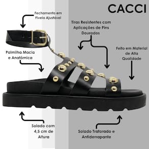 Descubra o equilíbrio perfeito entre estilo e conforto com nossa Sandália Cacci, uma combinação perfeita entre moda e conforto. Com um design moderno, ela oferece uma opção versátil para quem busca praticidade sem perder o charme.