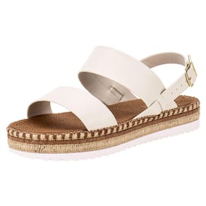 Sandália Feminina Flat Moleca 5447518 de salto baixo com solado de 3 cm. Feita em Napa Turim, com palmilha em EVA e sola em borracha. Acabamento colado/costurado e fechamento por fivela para um ajuste seguro e confortável. Ideal para o dia a dia com elegância.