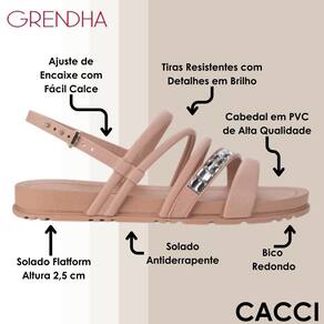 Feita em material PVC de alta qualidade, com seu solado flatform antiderrapante e com palmilha anatômica. Com suas tiras resistentes e firmes com aplicações incríveis de brilhos.