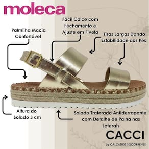 A Sandália Moleca Flatform combina estilo natural e conforto em um design marcante e moderno. O solado flatform robusto oferece um visual contemporâneo, enquanto o detalhe em palha adiciona um toque rústico e sofisticado ao modelo. Suas tiras proporcionam estabilidade e conforto ao caminhar, fazendo dela uma escolha perfeita para os dias quentes de verão.