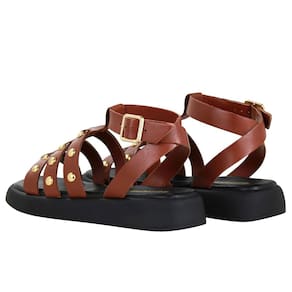 Sandália Flatform em couro atanado napoli sela. De solado Flat de 2 cm de altura antiderrapante com palminha confortável. Possui traseiro aberto com tira ajustável e fechamento prático em metal dourado. Gáspea com tiras transpassadas e enfeite de metal dourado sobre as tiras.
