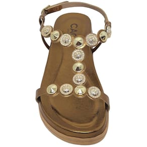 As tiras resistentes ornadas com pedrarias dourado, proporcionam não só um visual delicado e elegante, mas também um caminhar seguro e confortável. Feitas com materiais de alta qualidade, elas são projetadas para resistir ao uso diário sem perder a flexibilidade ou o charme.