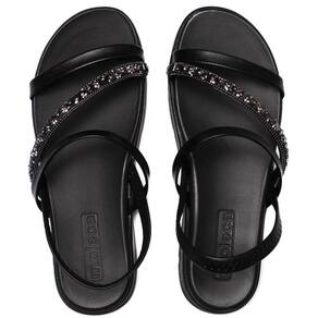 O destaque fica por conta da tira com pedrarias na parte frontal, que adiciona um toque elegante e glamouroso ao calçado.