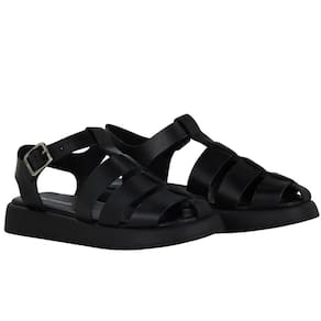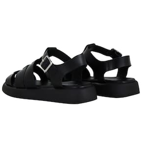 Sandália flatform em couro atanado napoli preta. De solado plataforma com palminha confortável. Possui traseiro aberto com tira ajustável e fivela de metal prata. Gáspea fechada com tiras transpassadas.