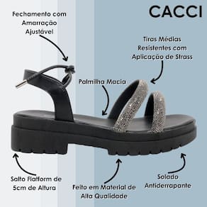 Conforto e charme em cada detalhe! Com tiras ajustáveis e palmilha macia, esta sandália é ideal para te acompanhar nos momentos mais especiais. Deixe seus pés brilharem com a Sandália Flatform da Cacci. Adquira já!