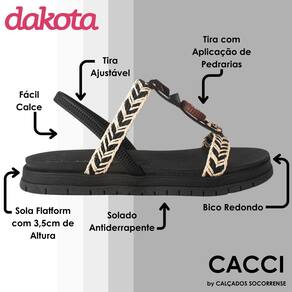 A Sandália Dakota Flatform com Pedrarias é a escolha ideal para poporcionar conforto e estilo nos seus dias de calor. Formada por tiras e tramados, conta com aplicação de pedrarias que traz um toque artesanal e sofisticado ao calçado. Sua sola flatform com 3,5cm de altura é anatômica e leve, garantindo conforto. Além de ser versátil, essa sandália é perfeita para acompanhar looks descontraídos no dia a dia e momentos de lazer.
