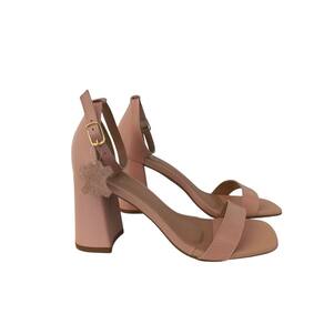 Sandália Feminina Nude Rosé Salto Alto Bloco Tira Fivela Calcanhar Fechado.