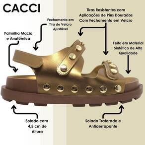 Conheça a nova Sandália Strass da Cacci, a sandalia de se apaixonar por onde for! Feito em material de alta qualidade que trás mais durabilidade ao calçado. Seu destaque é feito por suas duas tira com aplicações de pins dourados, que trás todo seu charme e atenção, além de tiras resistêntes ela possui seu fechamento autocolante a tornando fácil calce.