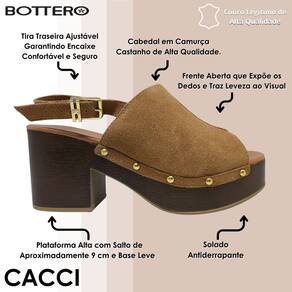Esta sandália Bottero une design sofisticado e conforto para mulheres que buscam destaque e bem-estar em um só calçado. Confeccionada em camurça castanho, ela apresenta salto plataforma alto com acabamento amadeirado que garante presença no visual e leveza ao caminhar. O solado leve torna o uso prolongado confortável, e a tira traseira ajustável assegura encaixe seguro e personalizado. A frente aberta valoriza os pés e confere charme ao modelo — ideal para composições modernas, casuais ou sociais.