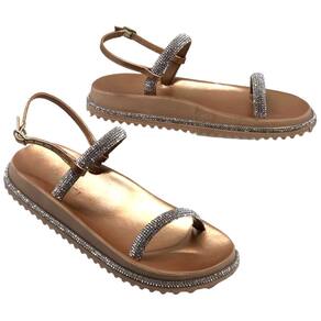 O destaque dessa sandália são as tiras adornadas com strass cintilantes. As tiras, feitas de um material durável e de alta qualidade, envolvem o pé de maneira confortável. Cada tira é cuidadosamente decorada com strass brilhantes, que capturam e refletem a luz, adicionando um toque de glamour e sofisticação ao design. Conta também com uma tira ajustável para deixar o calce mais fácil.