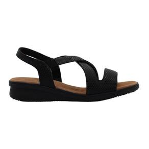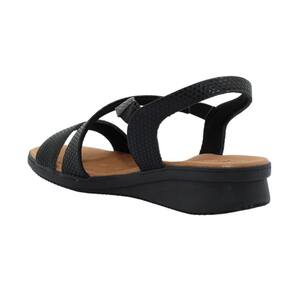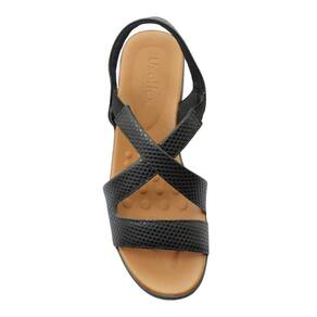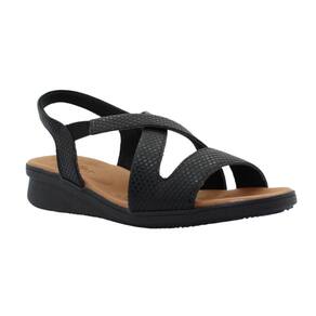 Sandália plataforma com cabedal em couro escama na cor preto. O modelo possui tecnologia Calce Fácil, com modelagem inteligente em adaptar o calçado a ergonomia dos pés.