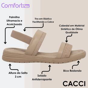 A Sandália Comfortflex Casual Feminina Elástico possui cabedal confeccionado em material sintético, proporcionando leveza e durabilidade. A palmilha é em EVA, que garante conforto e maciez ao caminhar, adaptando-se ao formato dos pés. O solado é feito de PVC expandido, oferecendo excelente aderência e resistência ao desgaste, ideal para o uso diário. O salto é anabela, com aproximadamente 3 cm, equilibrando conforto e elegância. As tiras são ajustáveis, em elástico, permitindo um encaixe perfeito aos pés. Com uma calcanheira levemente estruturada e bico arredondado, essa sandália possui fechamento em elástico ajustável no calcanhar, facilitando o calce, e seu acabamento é impecável, trazendo sofisticação ao design. A Sandália Comfortflex é a escolha ideal para quem busca estilo e conforto em qualquer ocasião