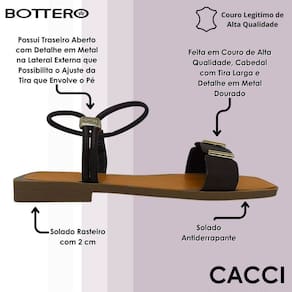 Essa sandália Bottero é perfeita para quem busca praticidade e elegância em um só modelo. Confeccionada em couro de alta qualidade, ela apresenta cabedal com tira larga e delicado detalhe em metal dourado que valoriza o design moderno. O traseiro aberto conta com ajuste prático na lateral, permitindo maior adaptação e firmeza ao caminhar.
