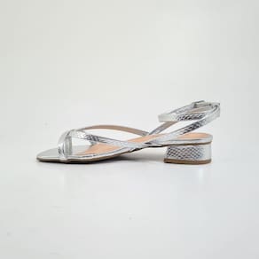 Toda a sandália é em material texturizado ouro, o salto possui 3cm de altura, o bico tem formato quadradinho, o solado é antiderrapante.
